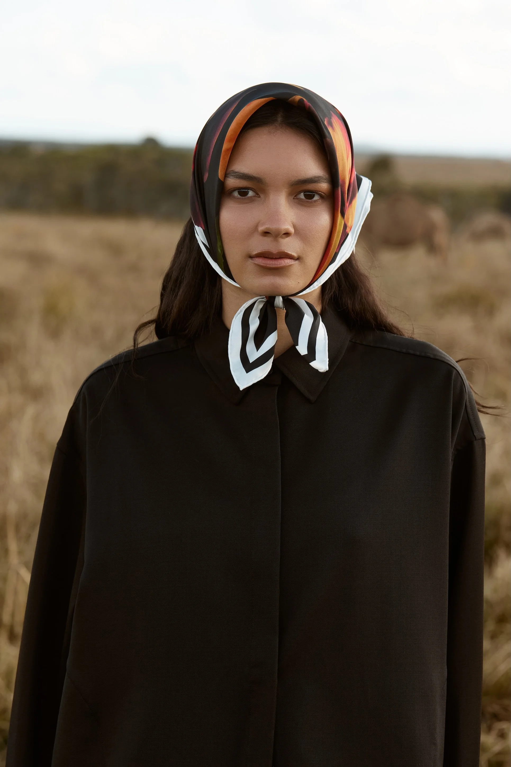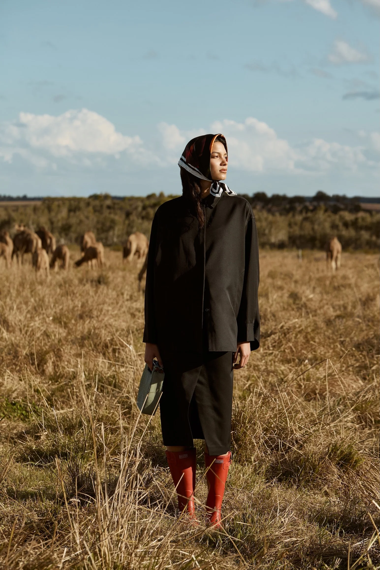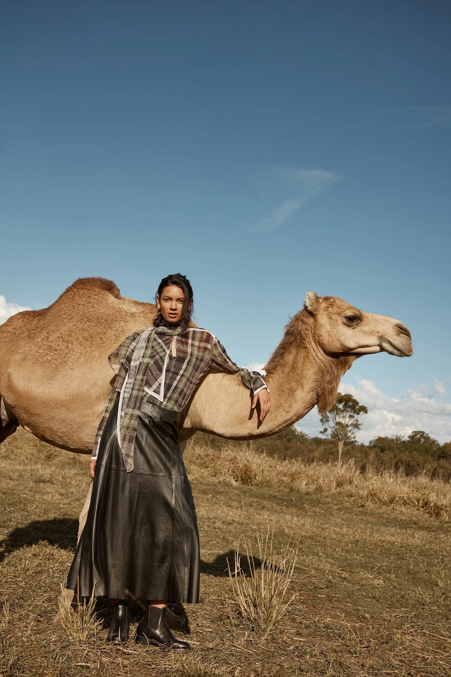 Top, skirt and scarf by Silk Laundry. Bag by The Hold and shoes by Baxter.